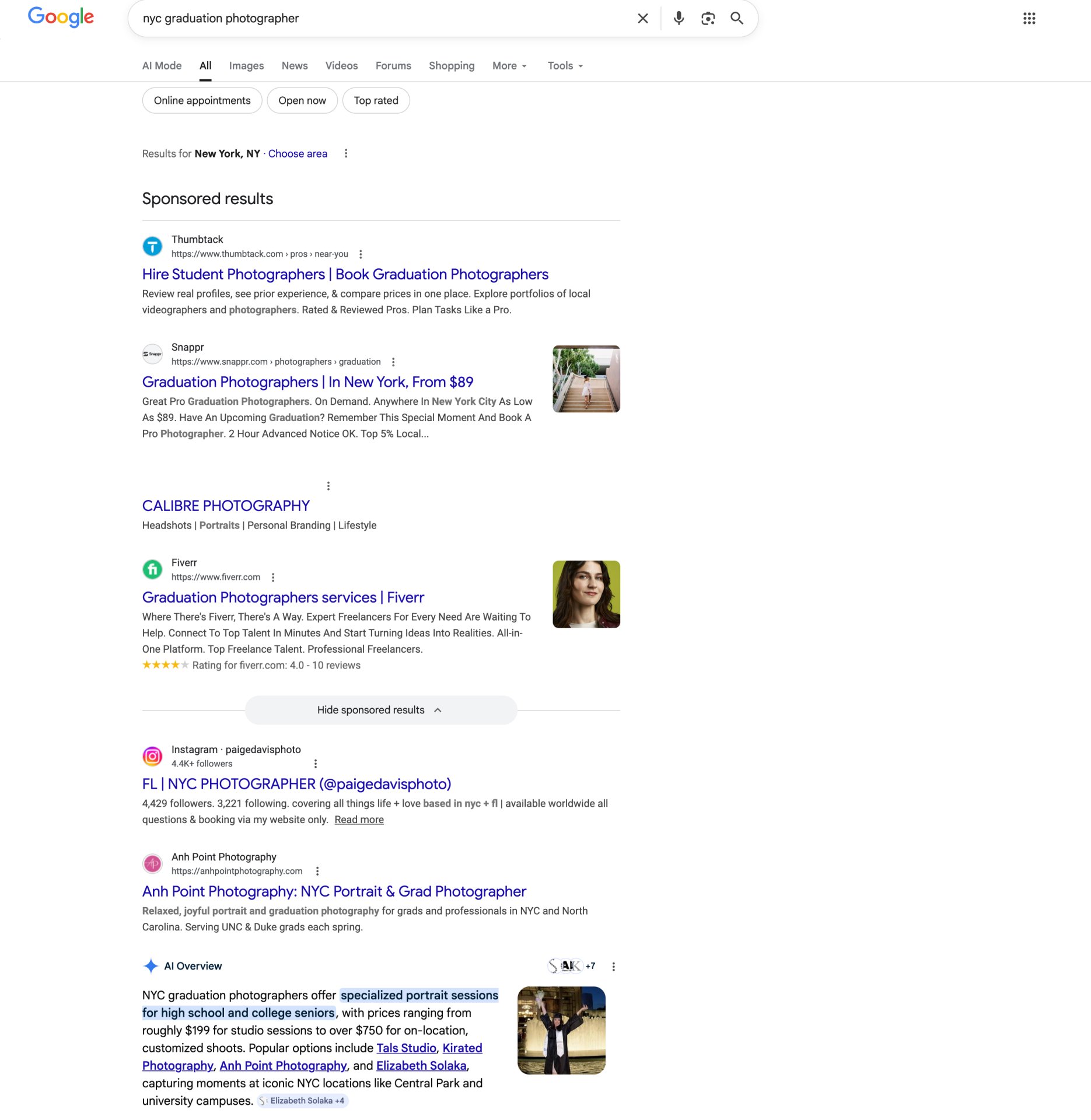 Google SERP for “NYC graduation photographer” | organic result + AI Overview | tap to view full size